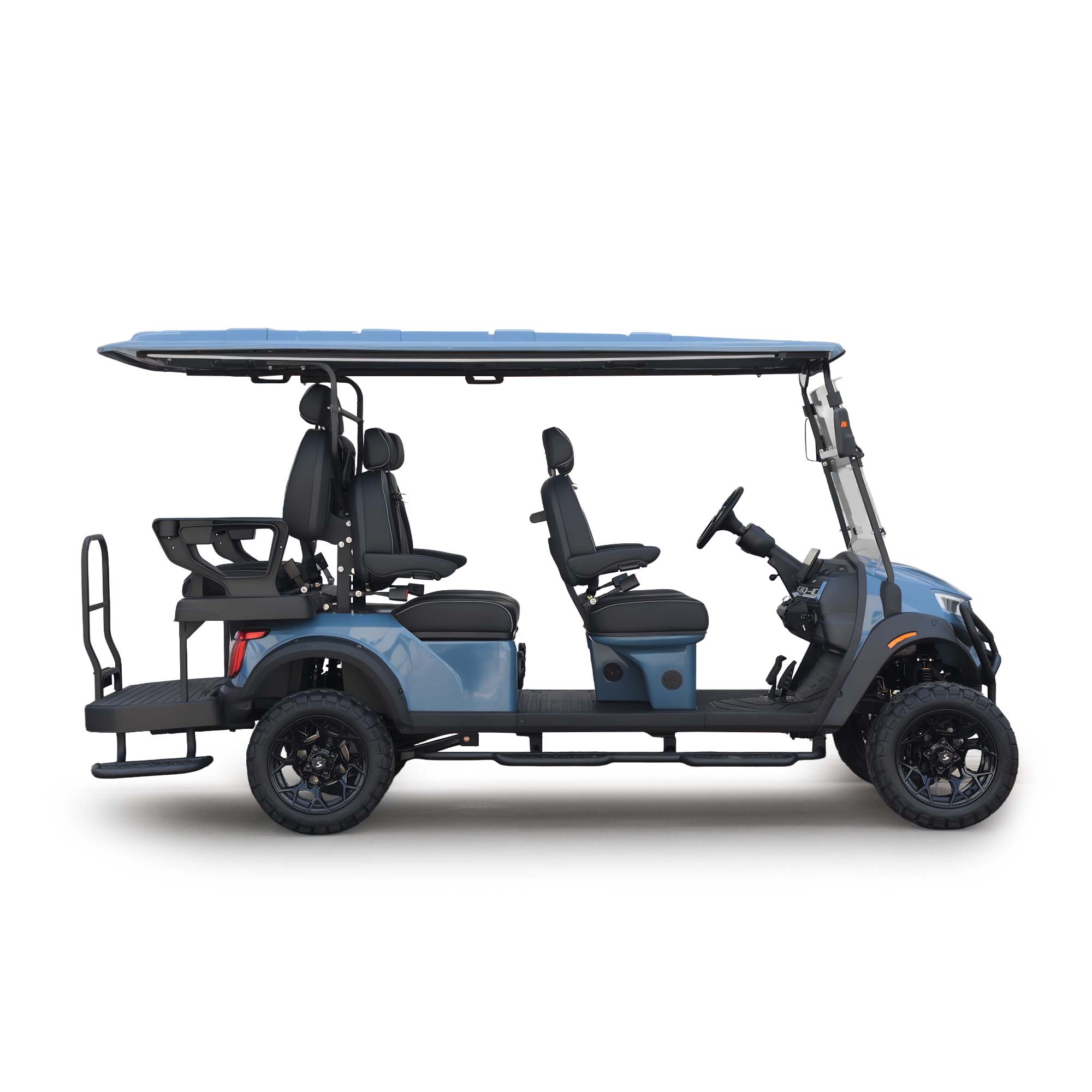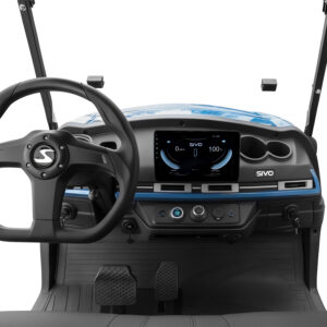 Inside, the cabin is thoughtfully designed to maximize comfort for all passengers, with forward-facing seating, premium materials, and intuitive technology. The large touchscreen display and integrated cooling dashboard system create a modern, user-friendly environment that feels closer to a car than a traditional golf cart.
